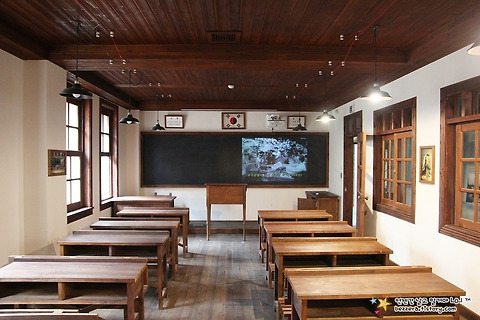 이화학당과 마찬가지로 이곳에서 당시 교실을 재현해 두고 있네요. 버튼을 누르면 영상이 나오는데, 영상 없는 사진을 찍었군요. ㅎㅎㅎ 교단 오른쪽으로는 교복과 모자가 몇 벌 준비되어 있던데, 직접 입어보고 사진을 찍을 수도 있습니다.