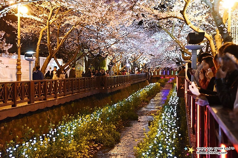 여좌천은 밤이되면 더 아름다운 곳으로 바뀝니다. 낮에 볼 수 없었던 예쁜 조명에 불이 들어오고, 분위기는 더 샤방샤방하게 바뀌니 꼭 가봐야할 필수코스 되겠습니다. 축제기간에는 사람이 조금 많긴 하지만, 한 곳에서 자리 잡고 사진 찍는 사람들은 없기 때문에 사진찍기 좋은 포인트에서 누구나 셀카를 담아볼 수 있답니다.