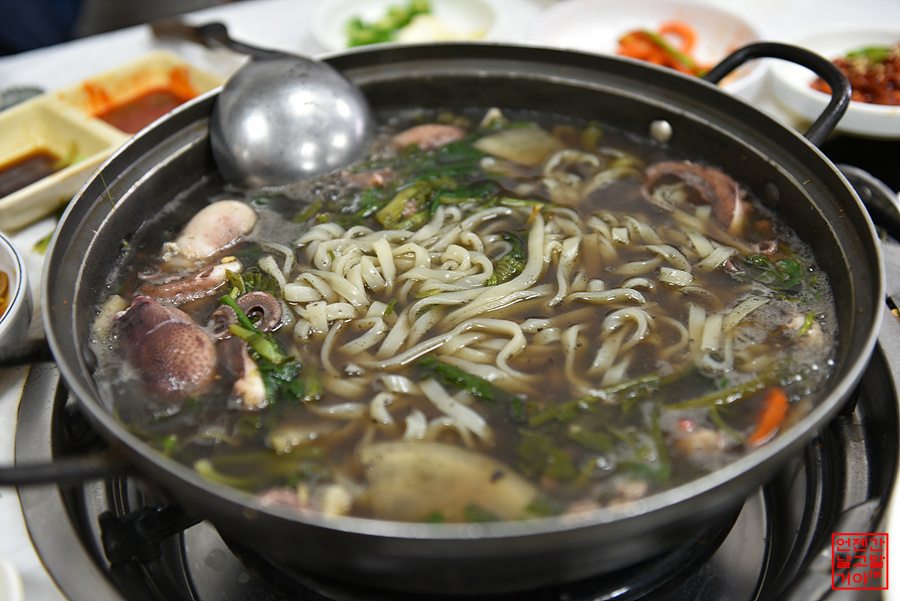 마지막은 칼국수 면을 넣고 마무으리~! 주꾸미에서 터져 나온 먹물로 국물이 검게 됐는데, 덕분에 국물 맛이 한층 더 좋아졌어요.