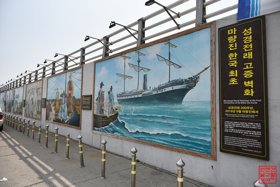 여긴 마량포구 방파제. 담벼락에 갓 쓴 선비들 벽화가 있네요. 이게 뭔가 자세히 보니 우리나라에 성경이 전래된 지 200년이 된 기념으로 벽화를 남겼네요. 우리나라에 성경이 제일 처음 들어온 포구가 바로 마량진 포구거든요. 표류한 영국 함선에 탄 마량진 첨사 조대복이 처음 선물로 받아 나왔다고 하네요.