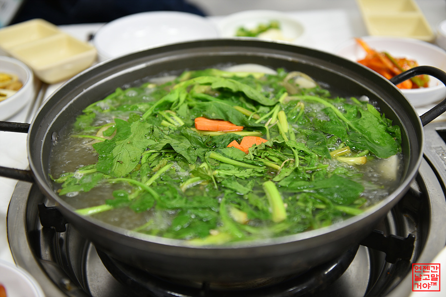 시금치, 쏙갓, 냉이를 올렸어요. 충청도는 탕에 냉이가 종종 올라옵니다.