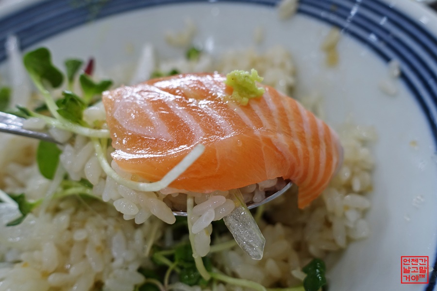 연어가 기름져서 느끼할 것 같지만 어린잎채소와~ 와사비가 아주 깔끔하게 정리해줍니다.