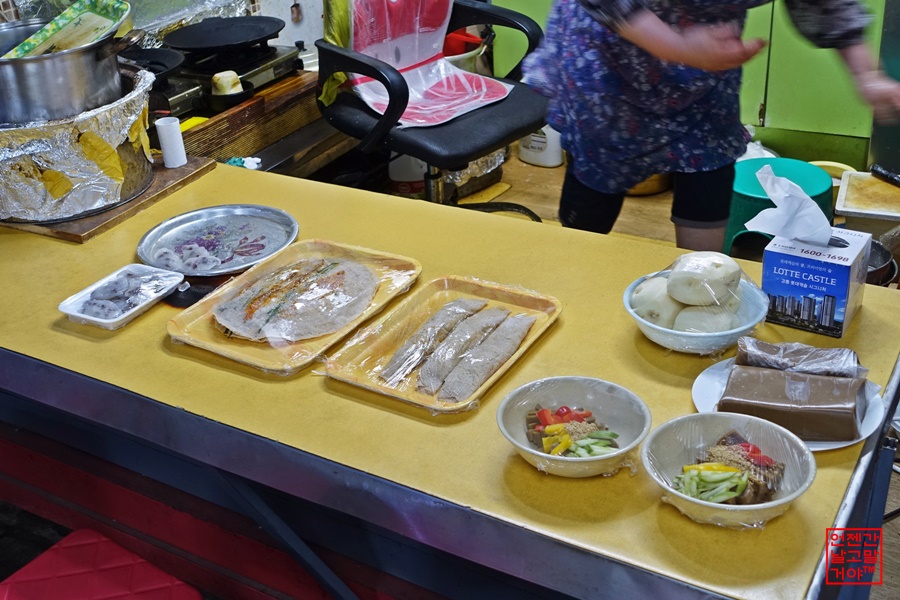 메밀전병, 부추전, 감자전, 감자떡, 도토리묵, 돼지껍데기 볶음등...