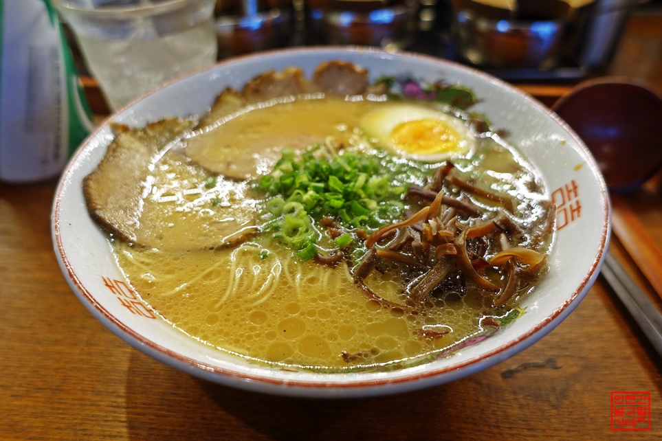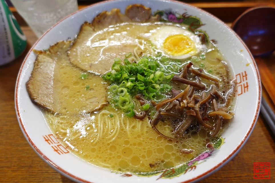 진한 돼지육수에 챠슈(돼지고기), 꼬들꼬들한 다시마, 간장으로 양념된 아지타마고(달걀)까지