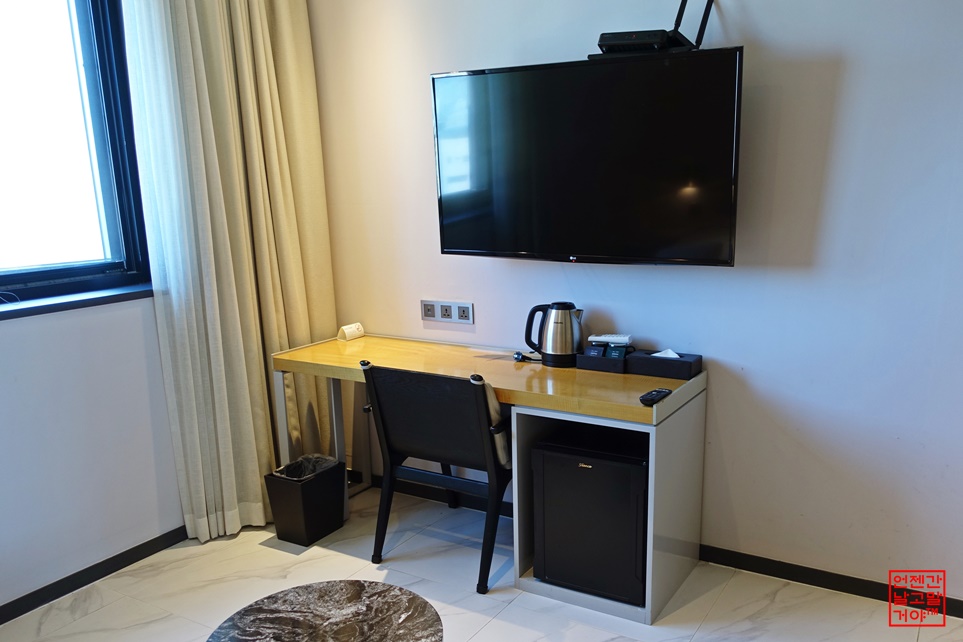 침대 맞은 편에는 작은 책상과 TV, 티주전자, 냉장고 있는데요.