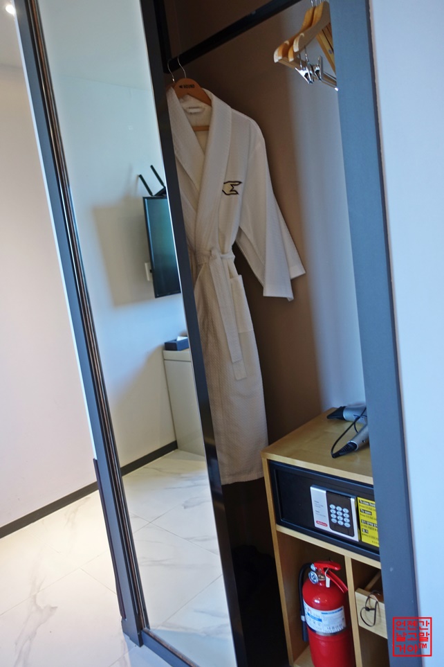 옷장 안에는 샤워가운 2벌과 금고. 드라이기가 있습니다.