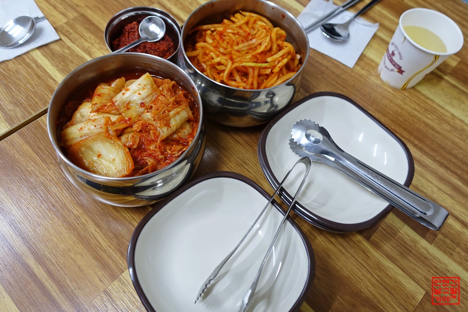 밑반찬으로는 궁합이 잘 맞는 배추김치와 무생채가 있습니다.