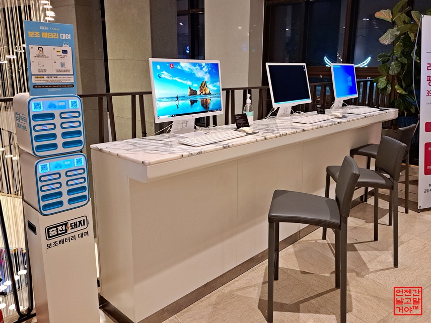 로비 한쪽에는 PC 를 누구나 이용할 수 있고요.