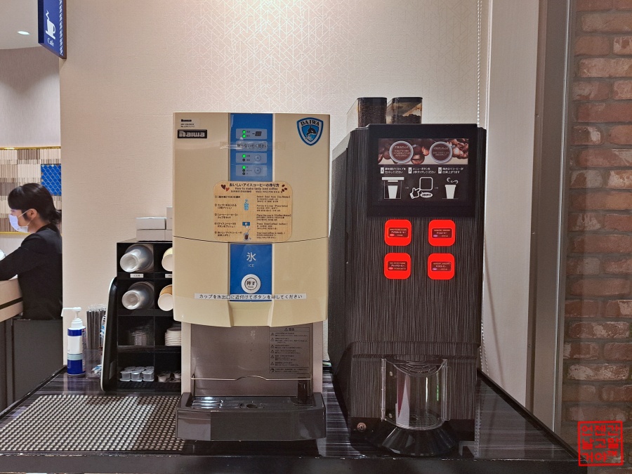 프론트쪽으로 더 들어가면 컵, 얼음정수기와 커피 자판기가 있습니다.
