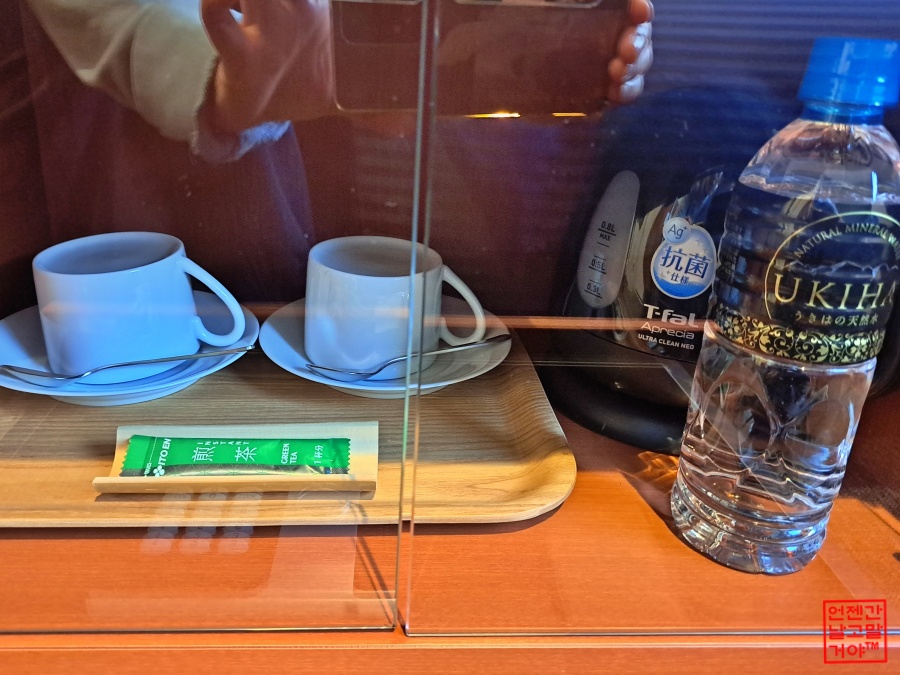 가운데 유리장 안에는 커피, 녹차, 커피잔, 전기주전자, 무료생수가 있습니다.