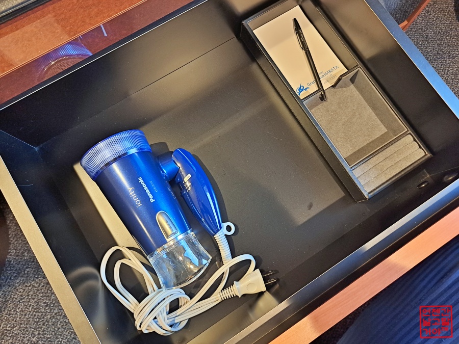 첫번째 서랍에 헤어드라이기와 필기 도구가 있고요.