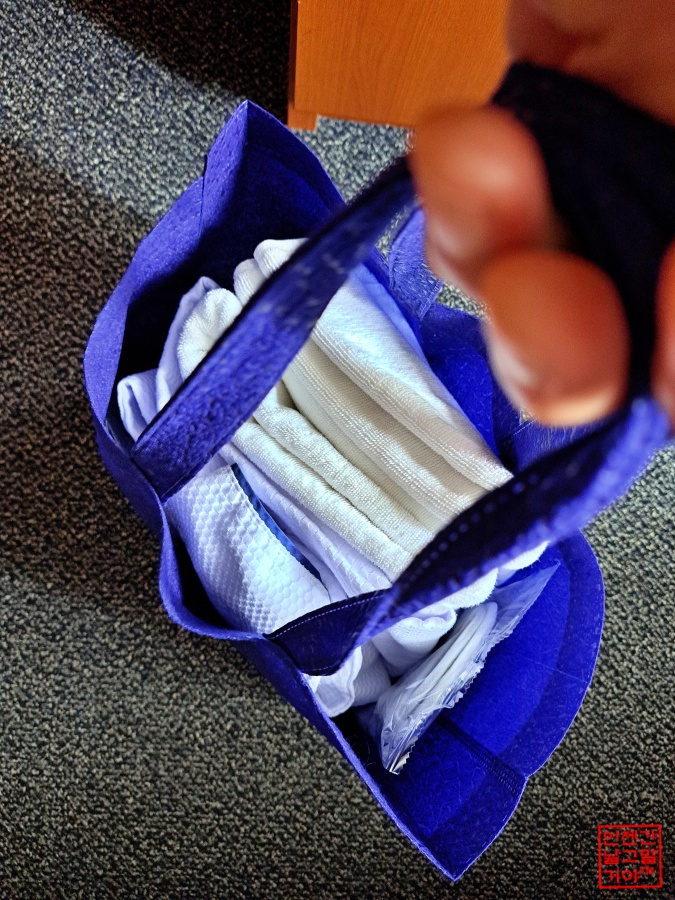 그 안에 사용했던 수건, 잠옷, 쓰레기를 담은 비닐을 넣어 문 밖에 두시면 가져가고