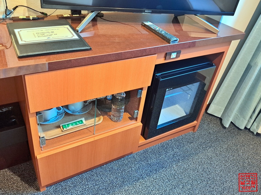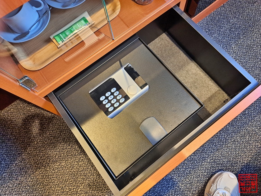 가운데 유리장 안에는 커피, 녹차, 커피잔, 전기주전자, 무료생수가 있습니다.