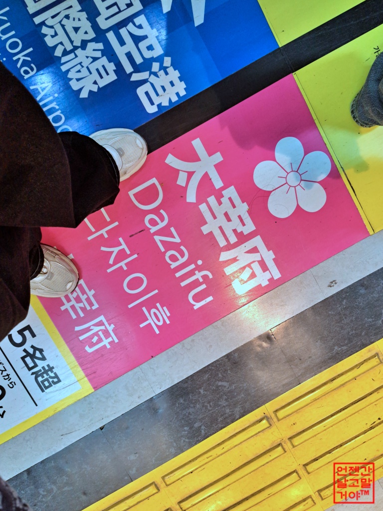 하카타 버스터미널 1층에 들어서자마다 있는 바닥 핑크선 다자이후 줄에 서있다가