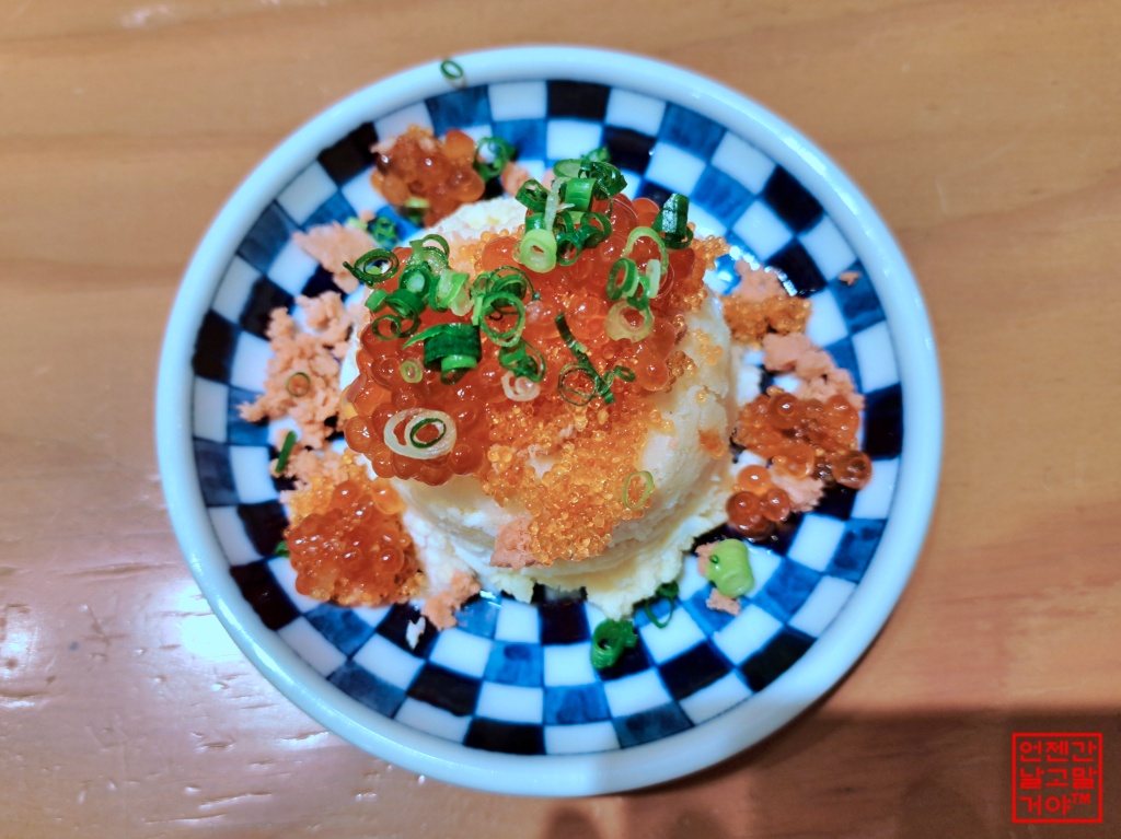 날치알 성게알이 올라간 마요네즈 찔끔 들어간 감자샐러드입니다.