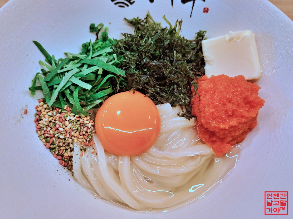 우동면 위에 유난히 붉은 명란젓, 버터, 김가루, 깻잎과 고수, 후리카케 (주먹밥고명), 달걀 노른자가 담긴 한그릇요리입니다.