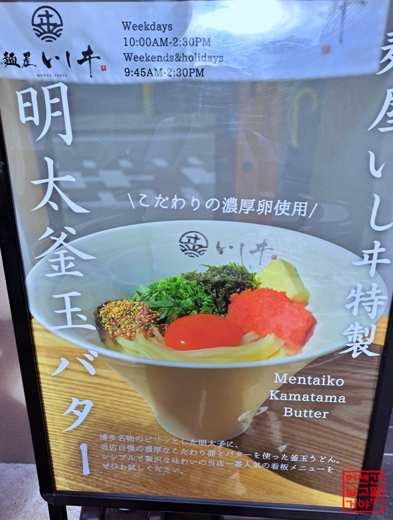 '멘야 이시이'의 대표 메뉴는 'Mentaiko Kamatama Butter' 우동입니다.